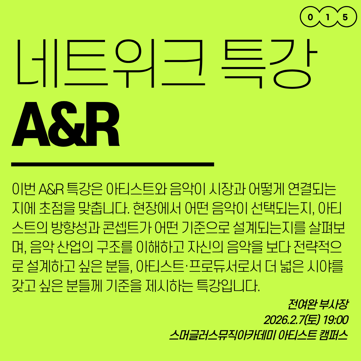 이번 A&R 특강은 아티스트와 음악이 시장과 어떻게 연결되는지에 초점을 맞춥니다. 현장에서 어떤 음악이 선택되는지, 아티스트의 방향성과 콘셉트가 어떤 기준으로 설계되는지를 살펴보며,